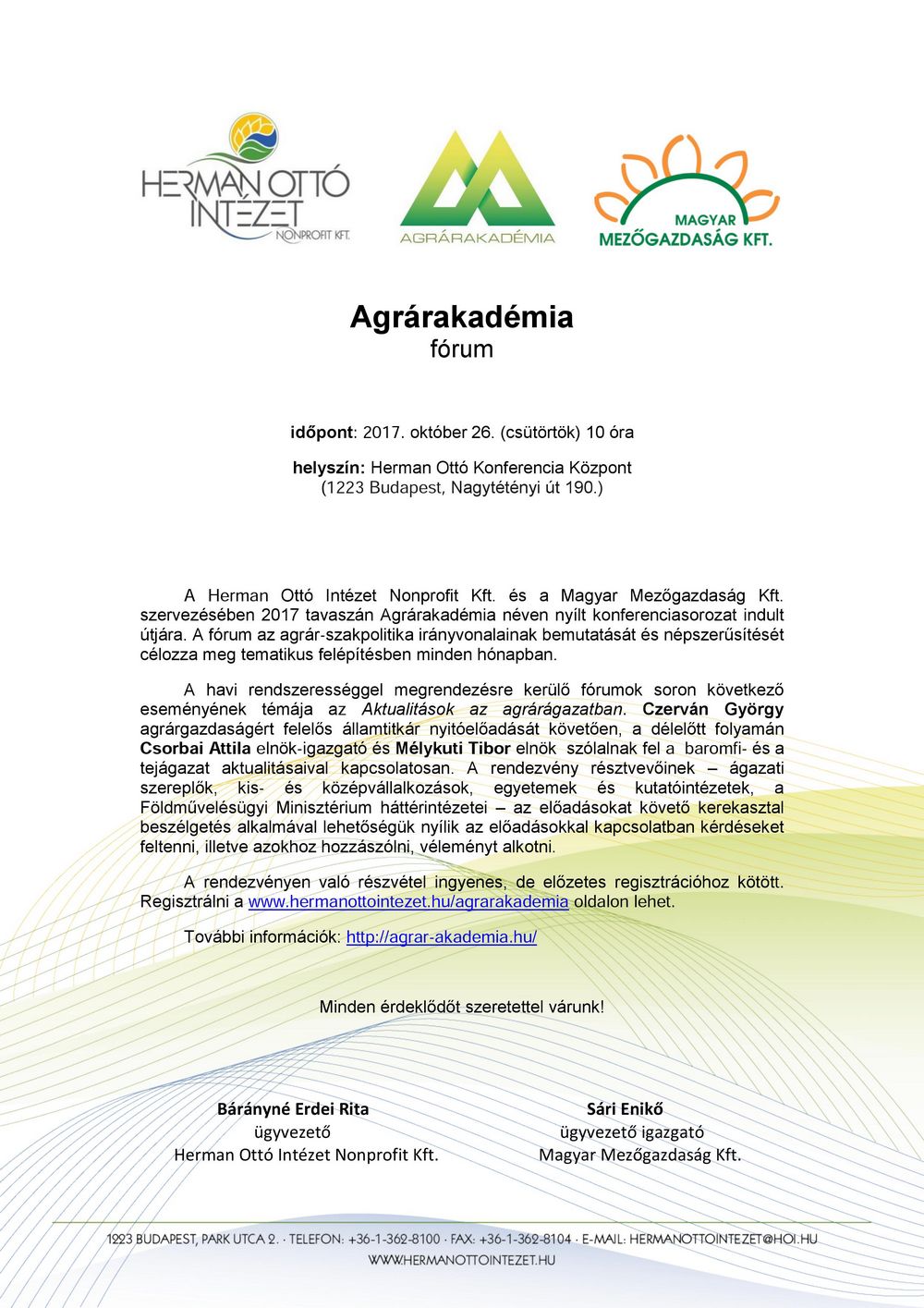 A Herman Ottó Intézet Nonprofit Kft. és a Magyar Mezőgazdaság Kft. szervezésében 2017 tavaszán Agrárakadémia néven nyílt konferenciasorozat indult útjára. A fórum az agrár-szakpolitika irányvonalainak bemutatását és népszerűsítését célozza meg tematikus felépítésben minden hónapban.