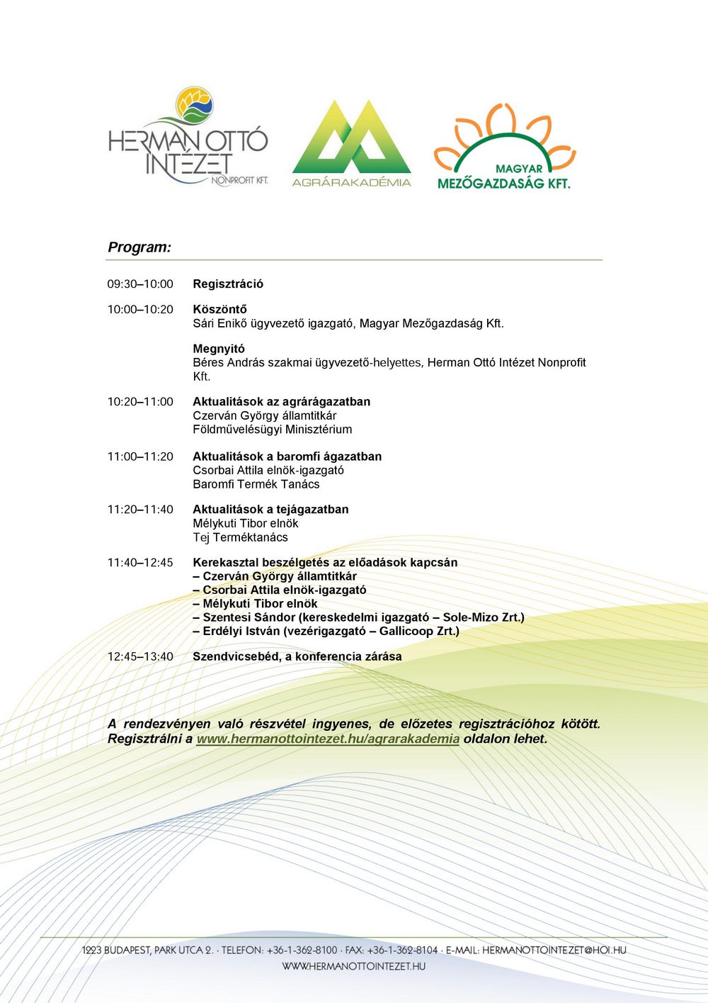 A havi rendszerességgel megrendezésre kerülő fórumok soron következő eseményének témája az Aktualitások az agrárágazatban. Czerván György agrárgazdaságért felelős államtitkár nyitóelőadását követően, a délelőtt folyamán Csorbai Attila elnök-igazgató és Mélykuti Tibor elnök szólalnak fel a baromfi- és a tejágazat aktualitásaival kapcsolatosan. A rendezvény résztvevőinek – ágazati szereplők, kis- és középvállalkozások, egyetemek és kutatóintézetek, a Földművelésügyi Minisztérium háttérintézetei – az előadásokat követő kerekasztal beszélgetés alkalmával lehetőségük nyílik az előadásokkal kapcsolatban kérdéseket feltenni, illetve azokhoz hozzászólni, véleményt alkotni.